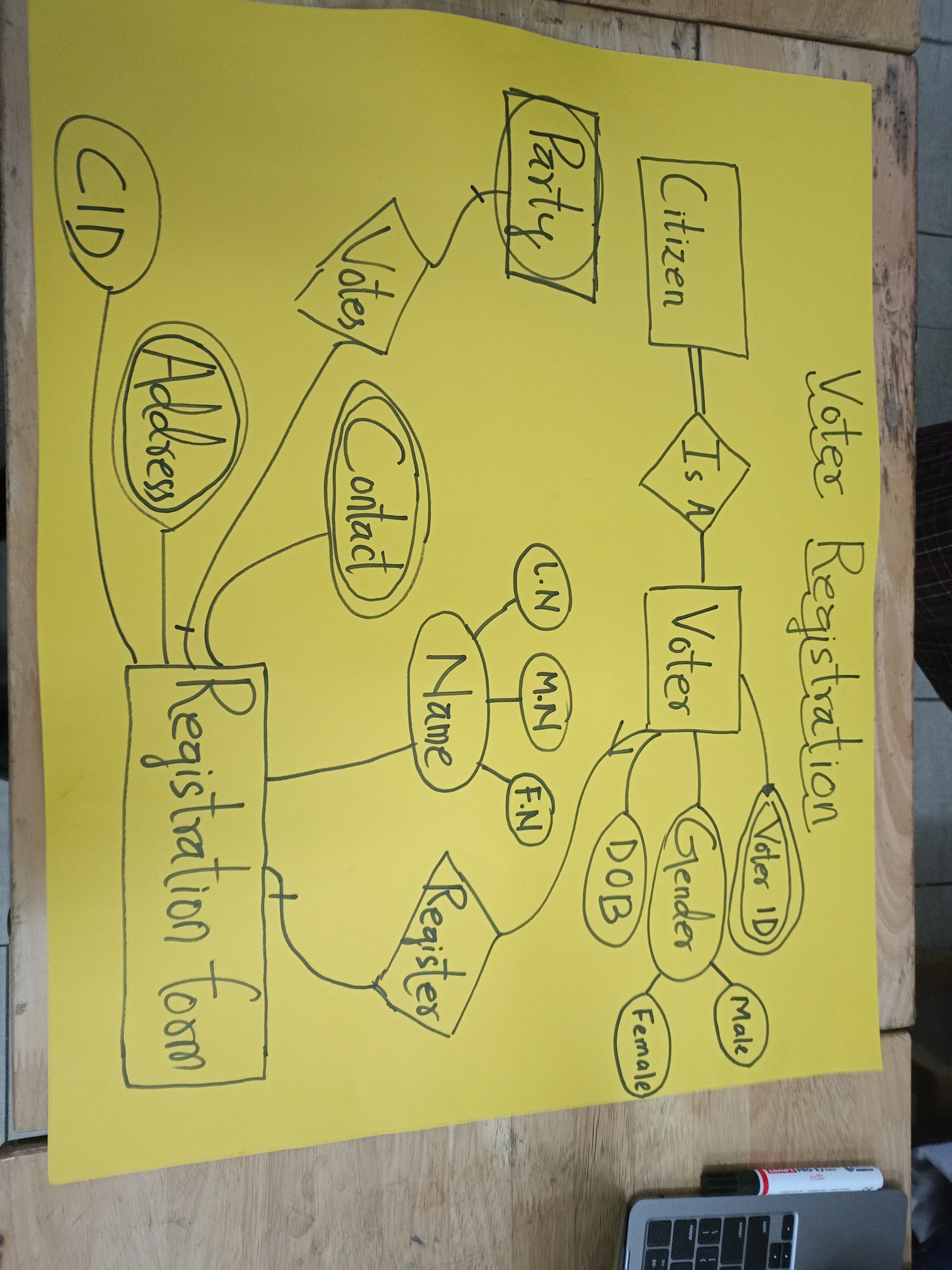 We shared our opinions and our knowledge on how to draw an ERD, then came to a one final solution. That final solution was written in the chart paper. This is the ERD for the voter registration that we drew.