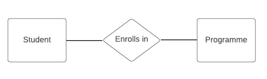 Entity can be either a living or non-living component and it is illustrated with an rectangle shape. For example both the student and the programme are entities.