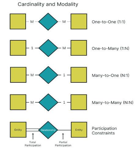 It depicts the relationship between two entities and it is represented with a diamond shape. Relationships are usually verbs such as assign, associate, or track and provide useful information that could not be discerned with just the entity types. Relationship can be one-to-one, one-to-many, many-to-one and many-to-many.