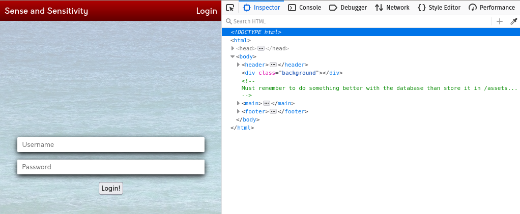 After seeing the question I was blank but I got the hint “Have a look at the source code on the /login page.” Then I clicked on the login and inspected the source code. The developer has left themselves a note in a comment, indicating that there is sensitive data in a specific directory.