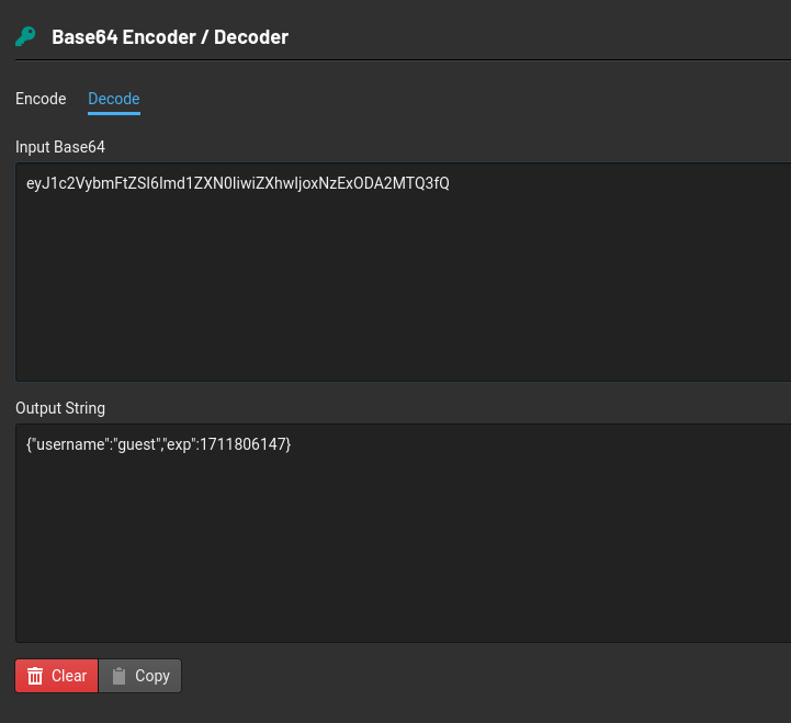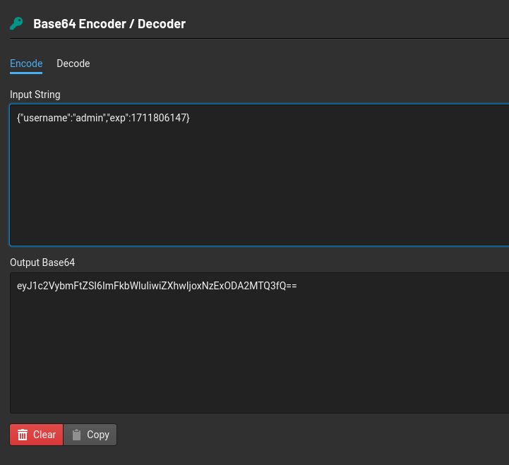 Don’t forget to put full stop at the end of our output base64. eyJ0eXAiOiJKV1QiLCJhbGciOiJub25lIn0=.eyJ1c2VybmFtZSI6ImFkbWluIiwiZXhwIjoxNzExODA2MTQ3fQ==.