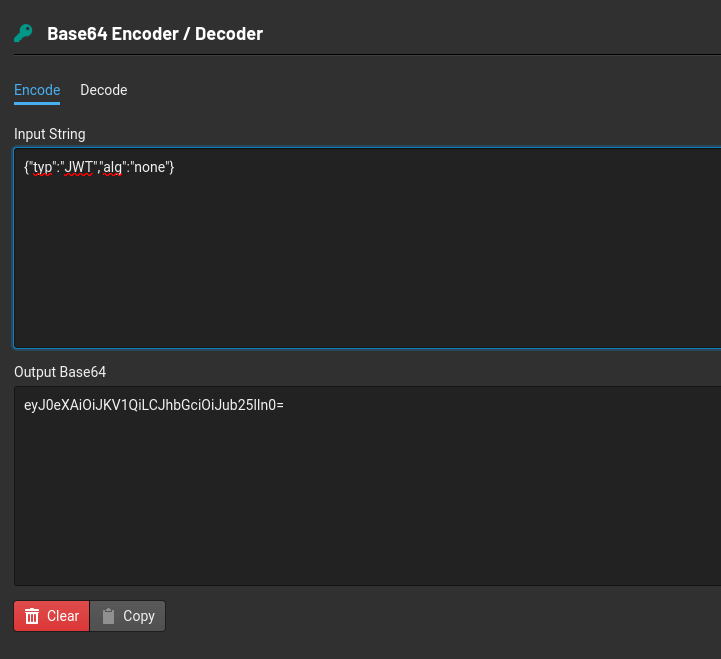 Copy the output string and encode it by changing the ‘HS256’ to ‘none’ and username ‘guest’ to ‘admin’ separately.