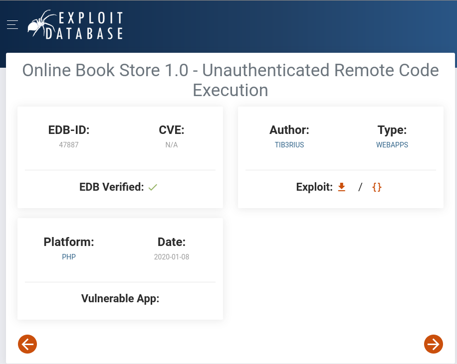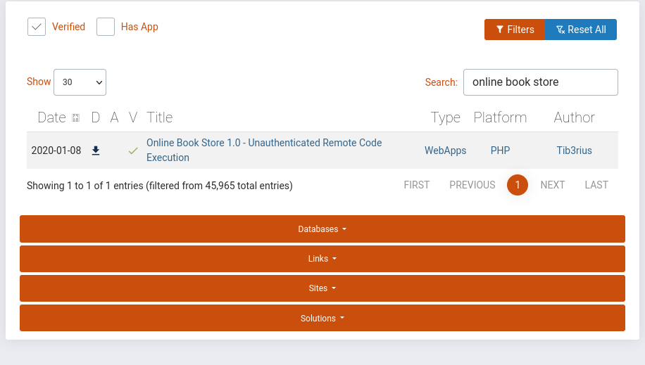 On the Exploit-DB site, I searched for the keyword ‘online book store’ and I filtered it by showing only verified ones.
