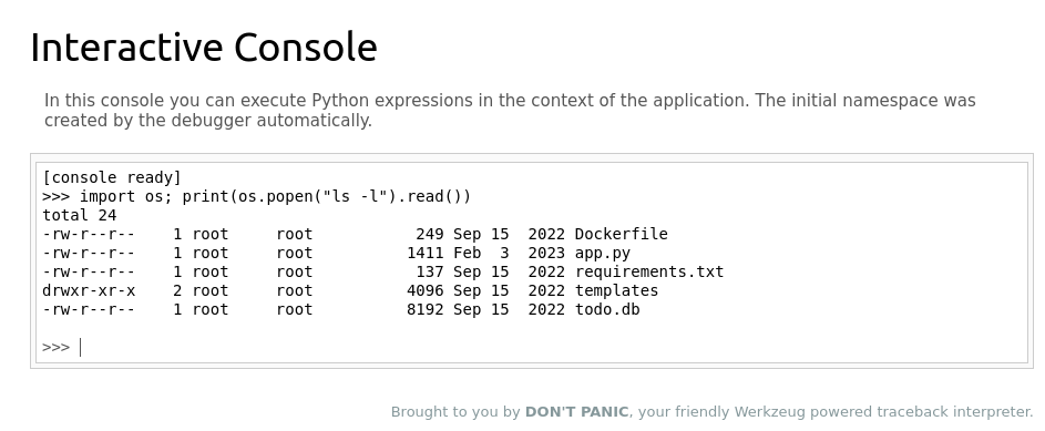 In the werkzeug console, I pasted the following python code to execute the ls -l command on the server. import os; print(os.popen(“ls -l”).read())