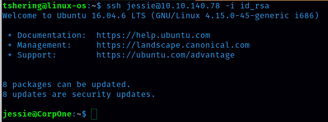 Got id_rsa file. Let’s try to crack it. Lets try to login with ssh. To get the SSH session we need a username to connect with this key. Remember there was a name commented there (Jessie). I am going to use it.