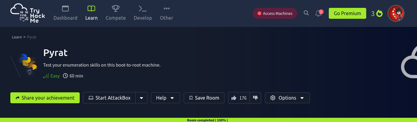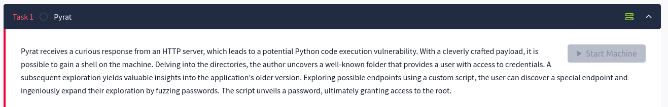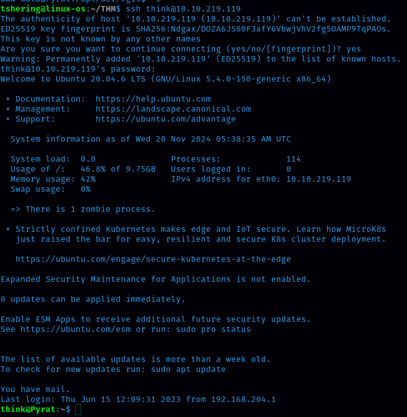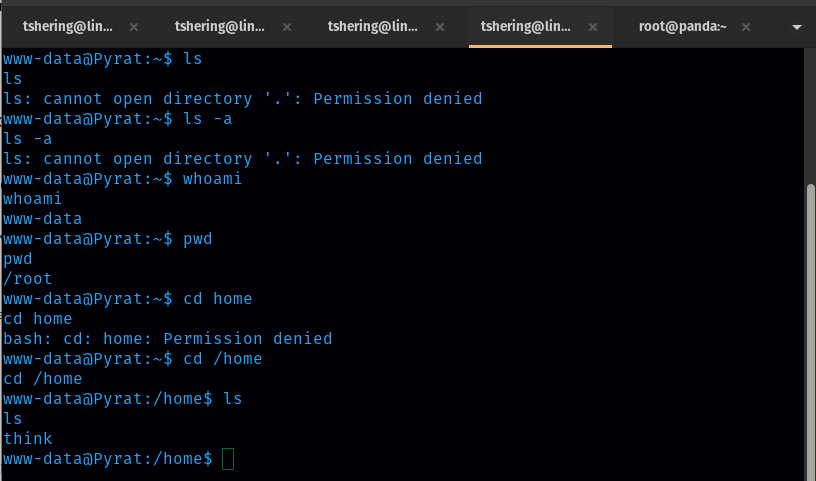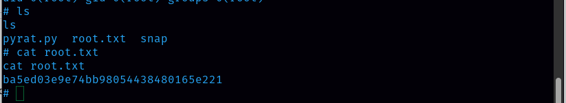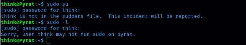 The next task is to get the root.txt flag. It isn’t as easy as I thought. User think can’t run sudo on the pyrat machine.