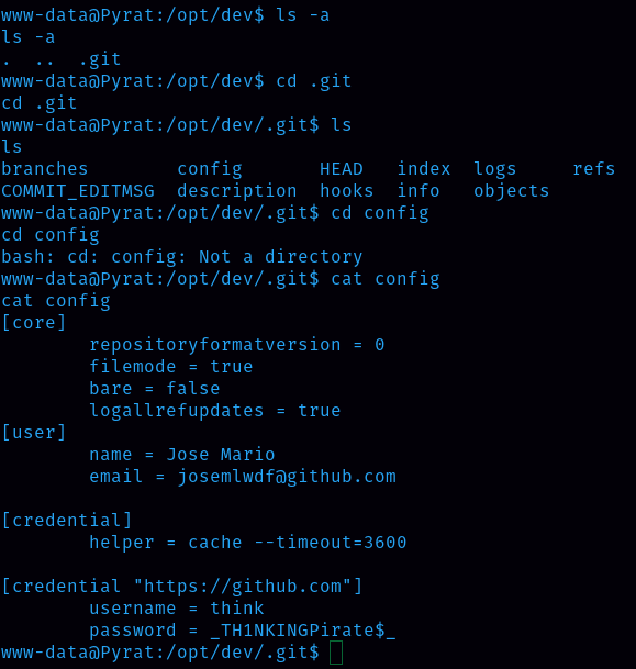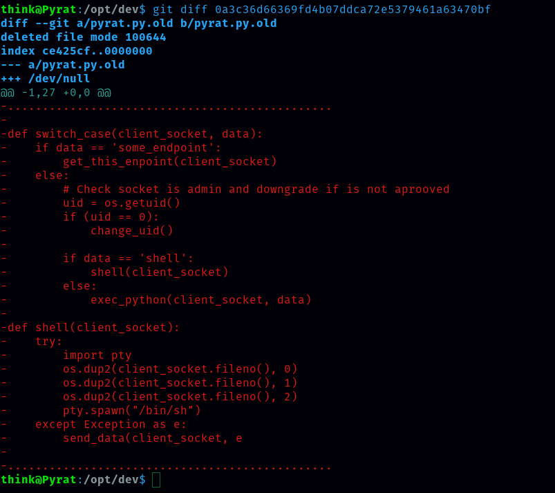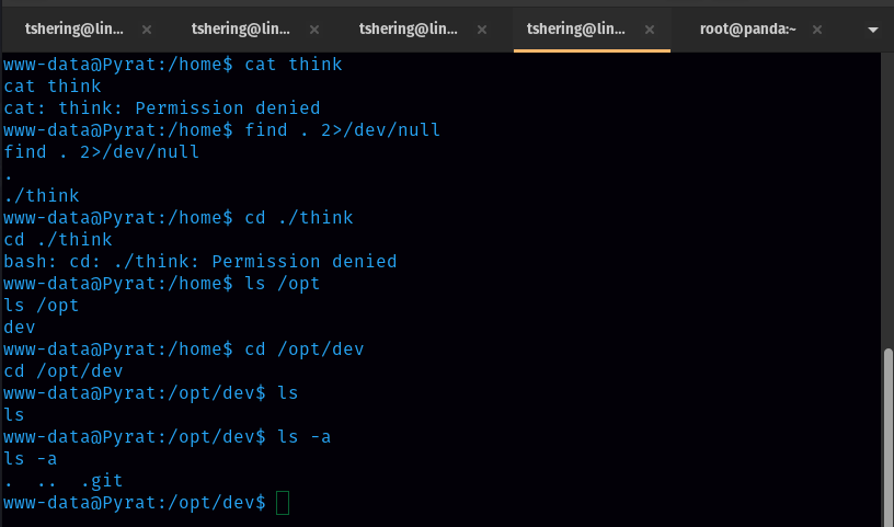 We don’t have permission to ‘think’ folder but found a git repo on /opt/dev directory.