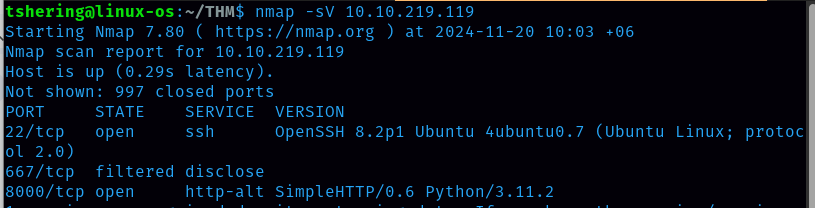 I discovered 2 open ports: 22(ssh) and 8000(SimpleHTTP/0.6 Python/3.11.2). let’s check the website with port 8000.